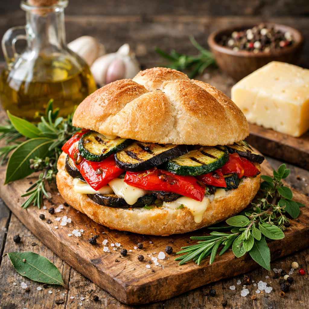 49. Peperoni, zucchine, melanzane, mix erbe (timo, rosmarino, alloro, maggiorana), formaggio, pepe, sale, EVO