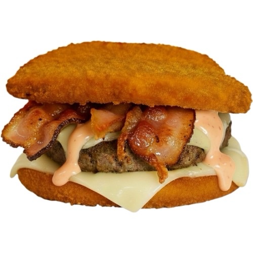 500gr di CICCIA e NIENTE PANE, 2 cotolette di pollo croccanti che racchiudono un hamburger di manzo e bacon croccante, salsa cocco e lime, formaggio filante, accompagnato da una porzione piccola di patatine fritte
