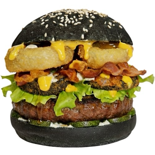 Hamburger di manzo, bacon croccante, scamorza affumicata, melanzane, cipolle fritte, salsa curry e mango, miele, olive taggiasche, zucchine grigliate, insalata. Il tutto racchiuso in un pane nero al carbone vegetale
