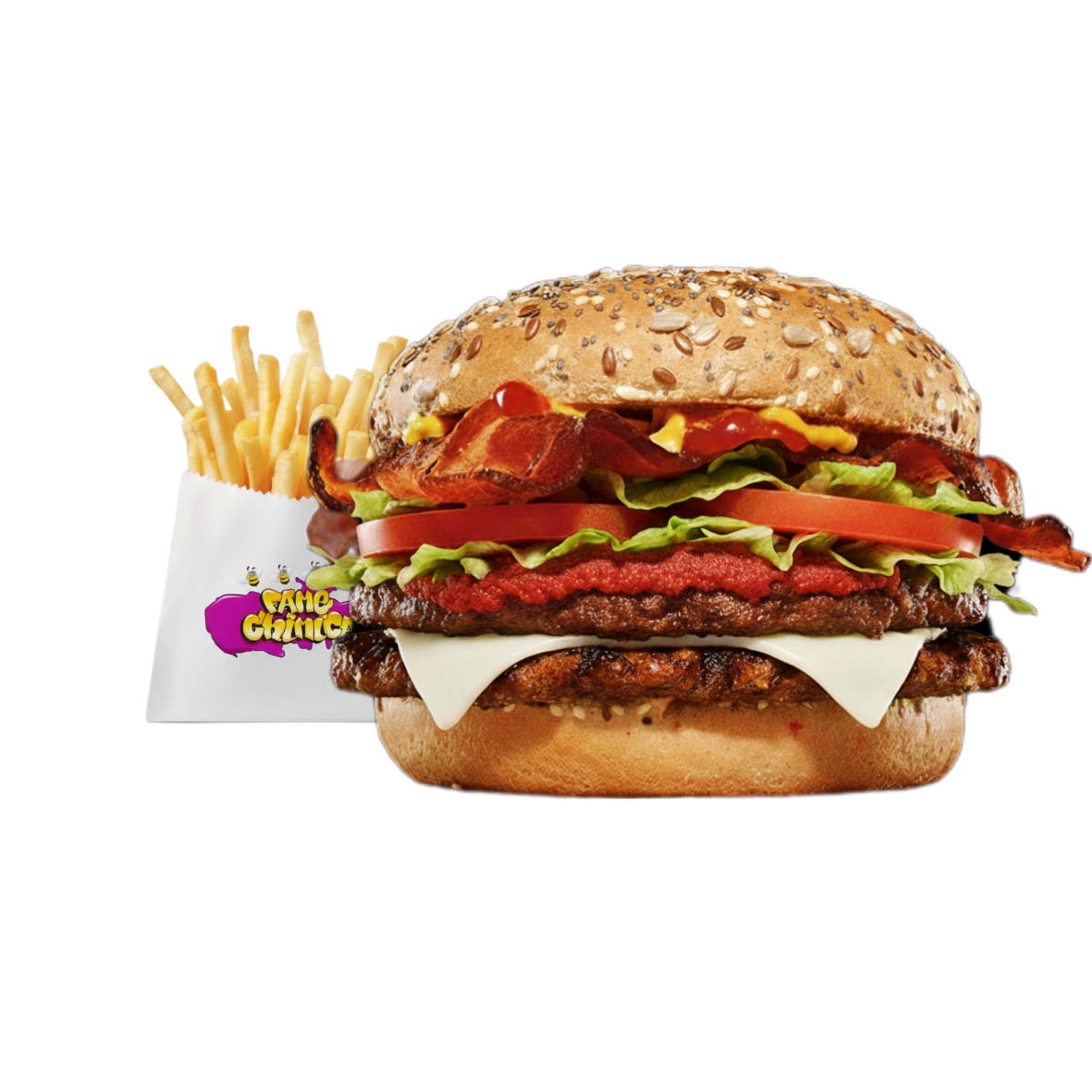 2 Hamburger da 150gr, ‘nduja, formaggio filante, bacon, salsa fame chimica, salsa bbq, insalata, pomodori, accompagnato da una porzione piccola di patatine fritte