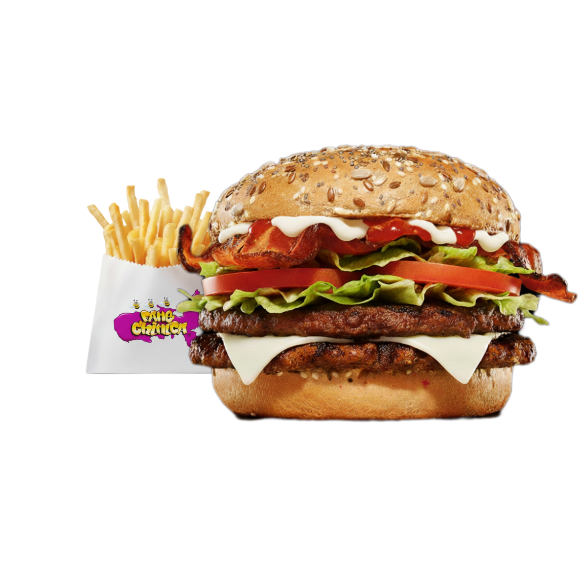 2 Hamburger da 150gr, bacon, formaggio filante, ketchup, maionese, insalata, cipolle alla birra, pomodori, accompagnato da una porzione piccola di patatine fritte