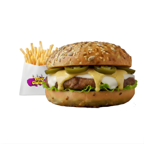 Hamburger, jalapeños, insalata, cipolle alla birra, salsa piccante, salsa fame chimica, accompagnato da una porzione piccola di patatine fritte