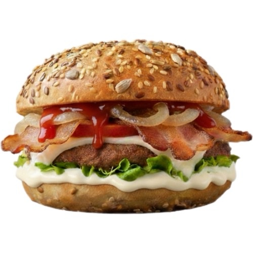 Hamburger, bacon, formaggio filante, insalata, pomodori, cipolle alla birra, maionese, ketchup