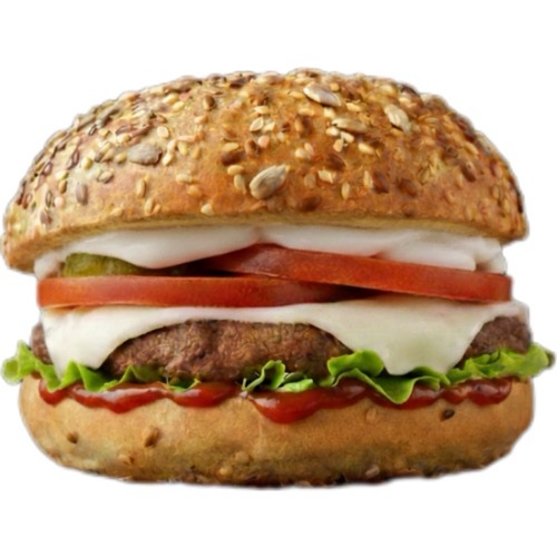 Hamburger, formaggio filante, insalata, pomodori, maionese, ketchup