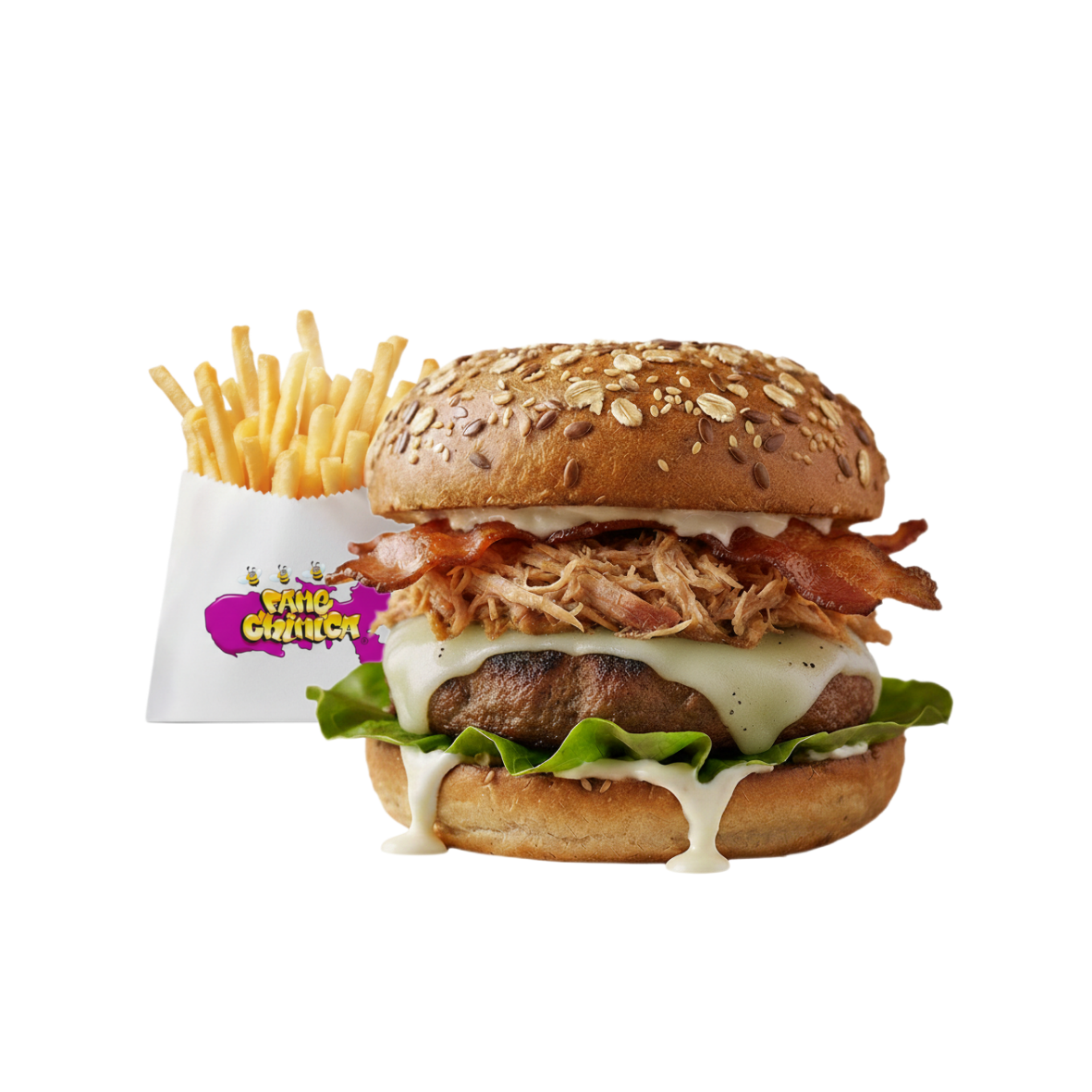 Salsiccia toscana, maiale sfilacciato, formaggio filante, bacon fritto, cipolle croccanti, insalata, maionese, accompagnato da una porzione piccola di patatine fritte