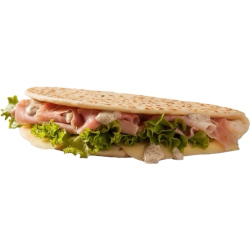 Prosciutto cotto, formaggio filante, salsa funghi, insalata